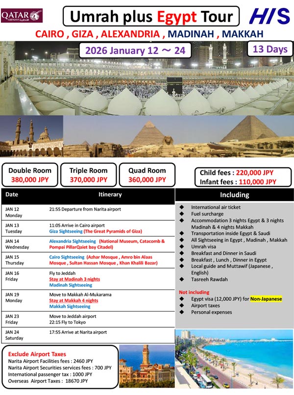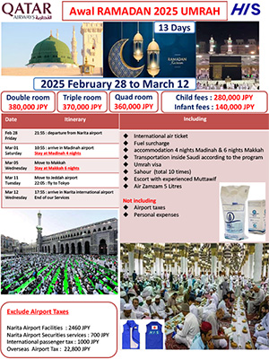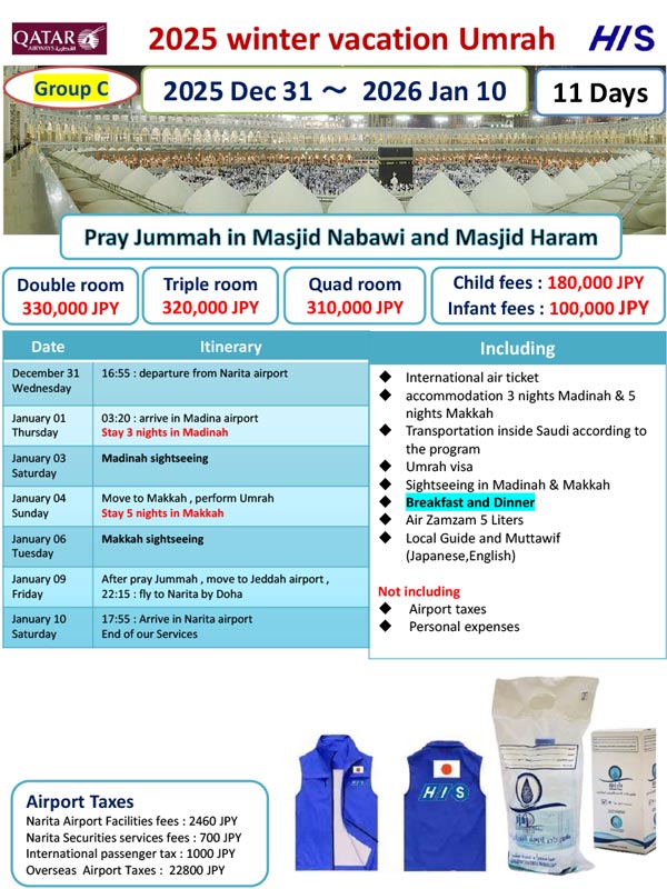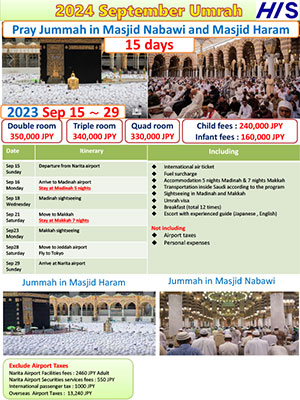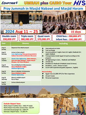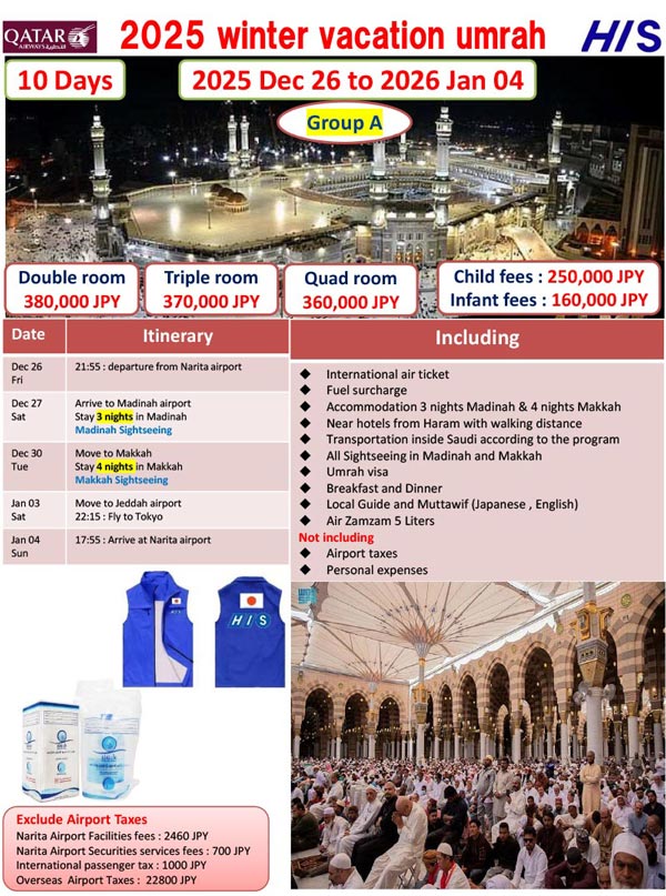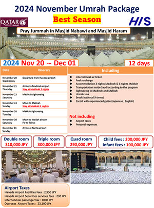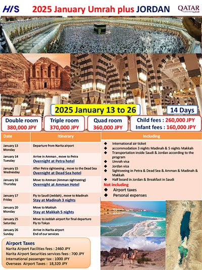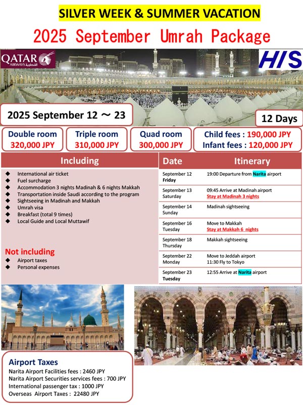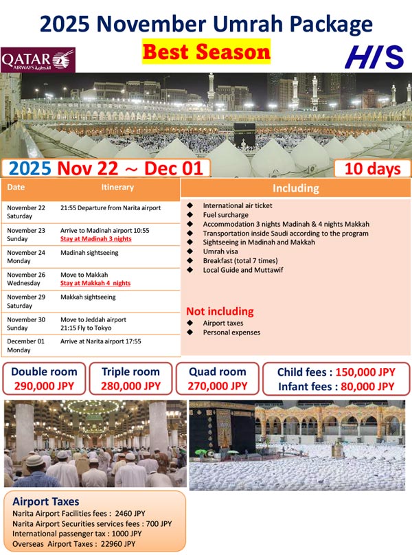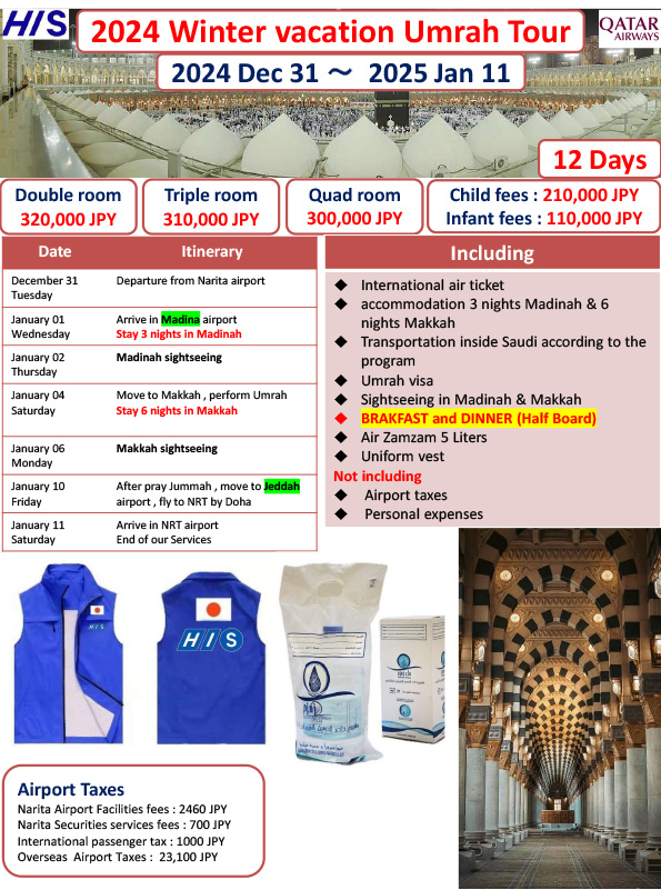 ※The visa guidelines for Hajj and Umrah change so frequently that it is no exaggeration to say that they change every time. The latest information is only available to customers who have booked a tour, so please consider the above as reference information.